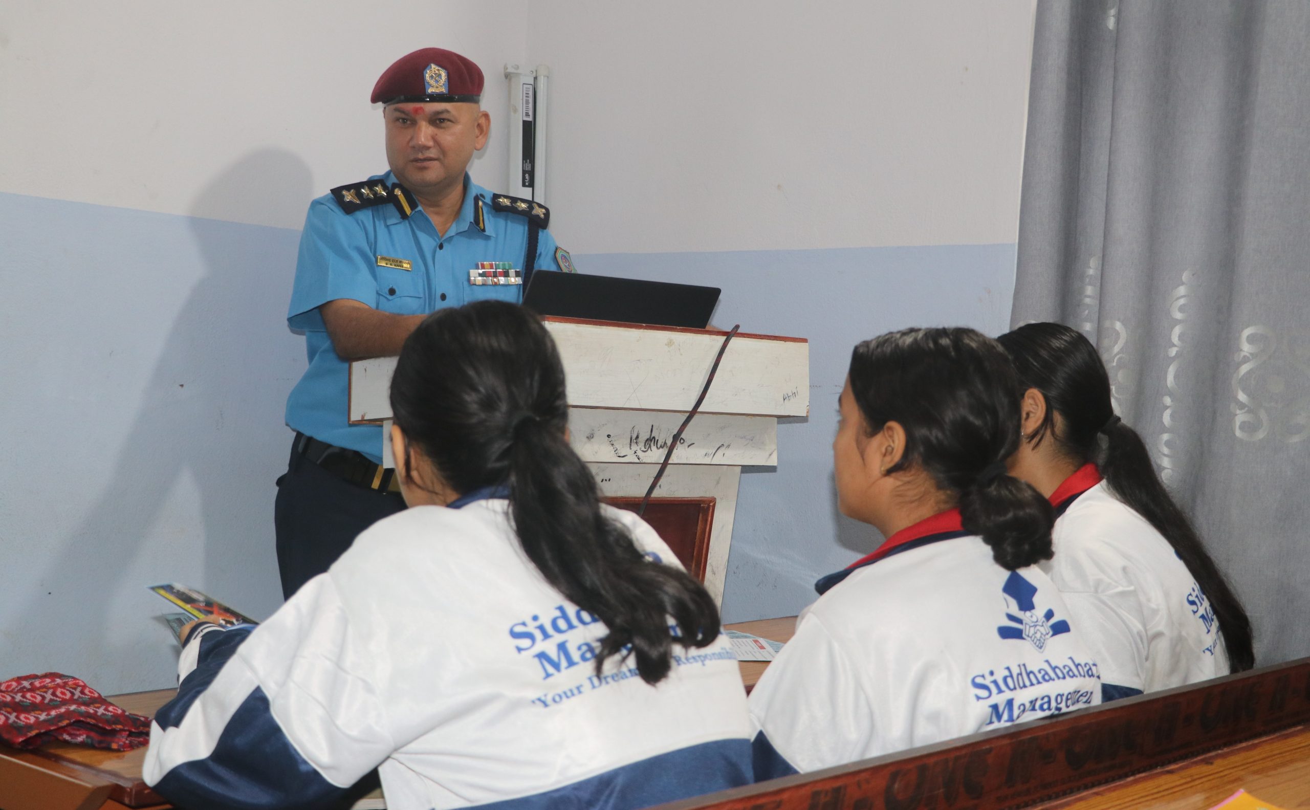 जिल्ला प्रहरी कार्यालय सिन्धुलीका प्रमुख प्रहरी उपरीक्षक गोबिन्द राज काफ्लेले कक्षा संचालन गदै गर्दा लागु औषत दुरुपयोग तथा अवैध ओसार पसार सम्बन्धी आफ्ना समुदायमा त्यस्ता गतिविधि देखिएमा प्रहरीलाई खबर गर्न सम्पूर्ण विद्यार्थीलाई आग्रह गर्नु भएको छ ।