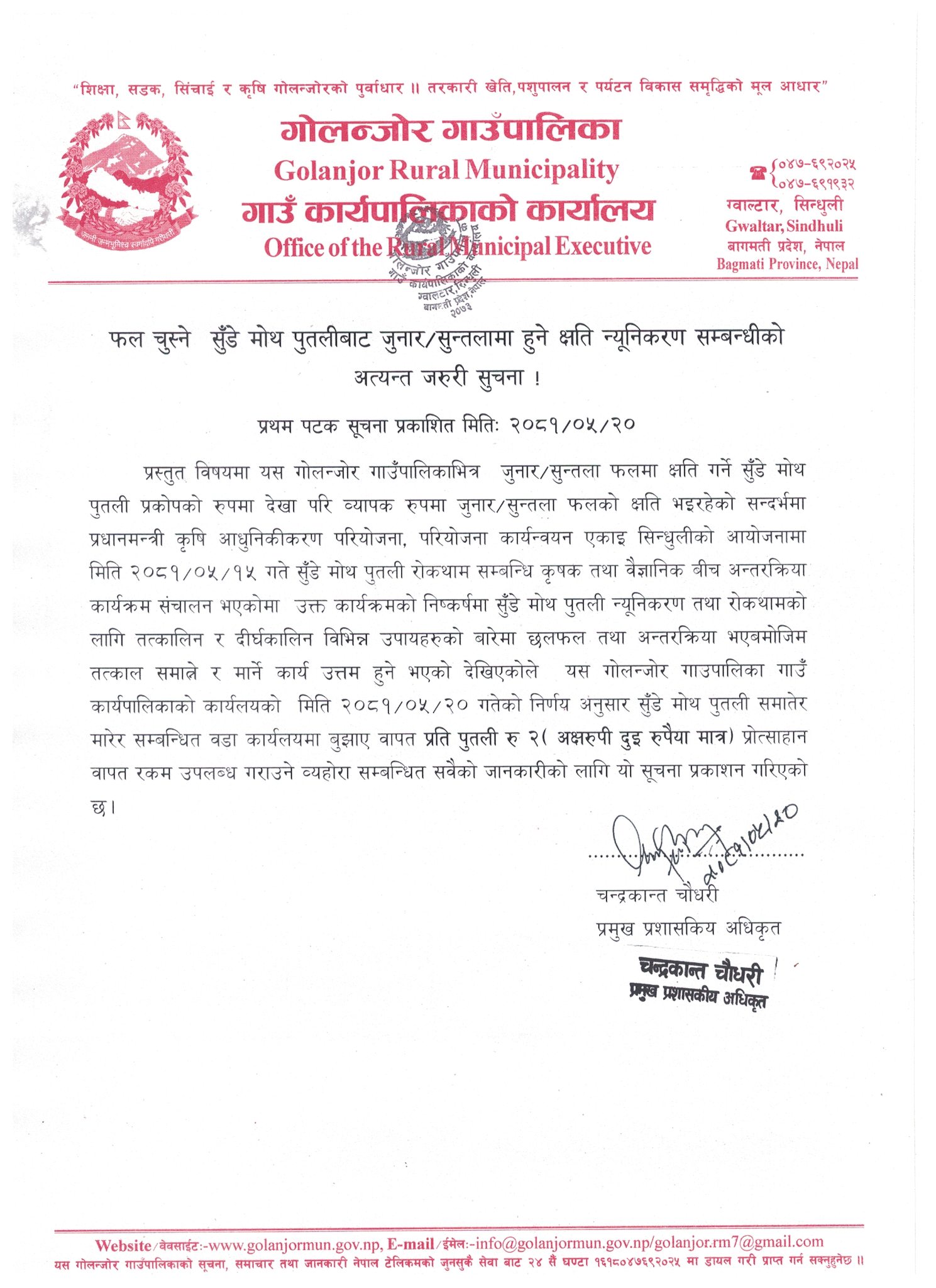सोहि अनुसार सुँडे मोथ पुतली समातेर मारेर सम्बन्धित वडा कार्यालयमा बुझाए प्रति पुतली २ रुपियाँ प्रोत्साहन दिने गोलन्जोर गाउँपालिकाले भदौ २० गते निर्णय गरेको गाउँपालिकाले जनाएको छ ।