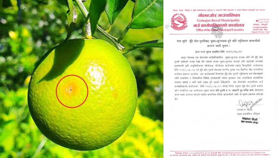 सिन्धुली । सिन्धुलीको गोलन्जोर गाउँपालिकाले जुनारको फल चुस्ने सुँडे मोथ पुतली समातेर मार्ने लाई २ रुपैयाँ दिने भएको छ । जुनार सुन्तला लाई सुँडे मोथ पुतली बाट जोगाइ क्षति न्यूनीकरण गर्ने उदेश्यले पुतली समातेर मार्ने कृषकलाई प्रोत्साहन गर्नको लागि गाउँपालिकाले प्रति पुतली २ रुपैयाँ दिने निर्णय गरेको हो ।