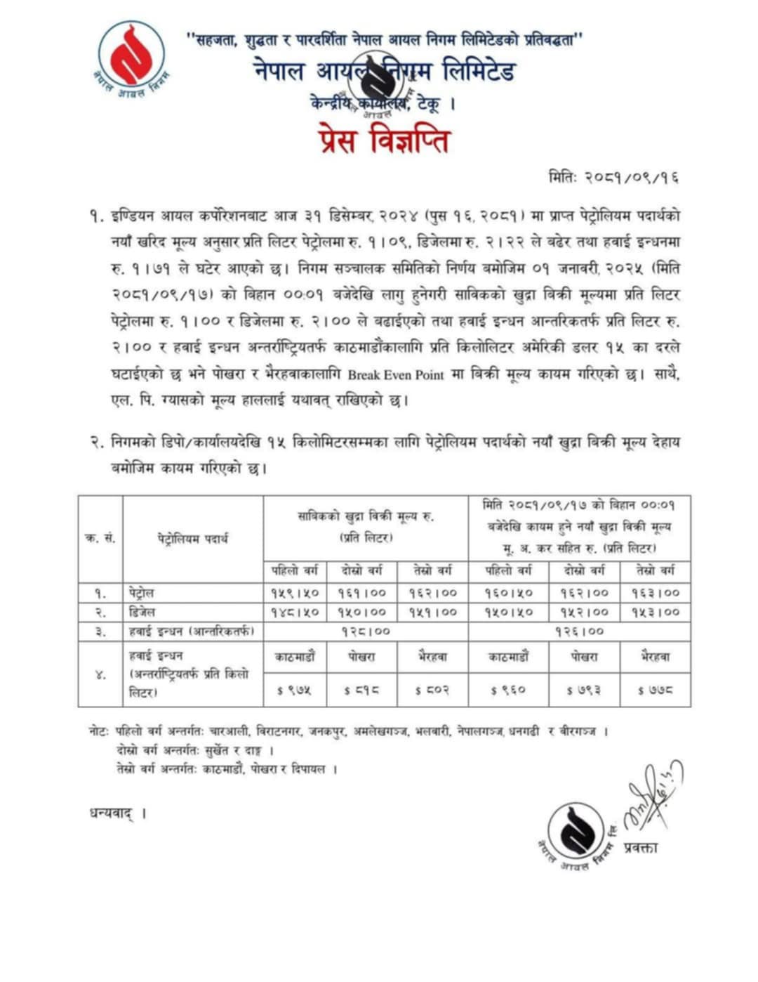 त्यस्तै, हवाई इन्धन आन्तरिकतर्फ २ रुपैयाँ र अन्तर्राष्ट्रियतर्फ १५ रुपैयाँले मूल्य घटाइएको छ । नयाँ मूल्यअनुसार पेट्रोलको मूल्य अब काठमाडौं, पोखरा र दिपायल क्षेत्रमा लिटरको १६३ रुपैयाँ पर्छ ।