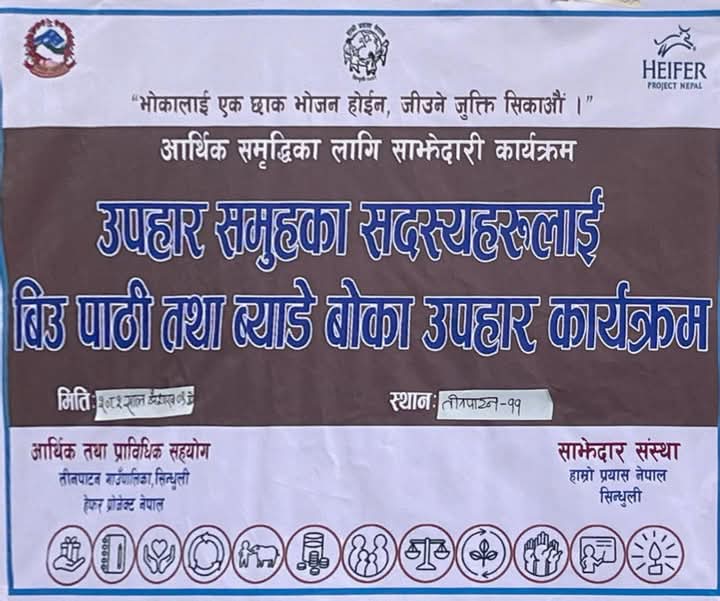 तीनपाटन गाउँपालिका र हेफर प्रोजेक्ट नेपालको आर्थिक तथा प्राविधिक सहयोग र हाम्रो प्रयास नेपालको सहजिकरणमा सञ्चालित कृषि तथा पशु विकासमा आधारित साना किसान तथा युवा उद्यमशिलता साझेदारी विकास परियोजना वीउ पाठी तथा वीउ बोका वितरण गरिएको हो।